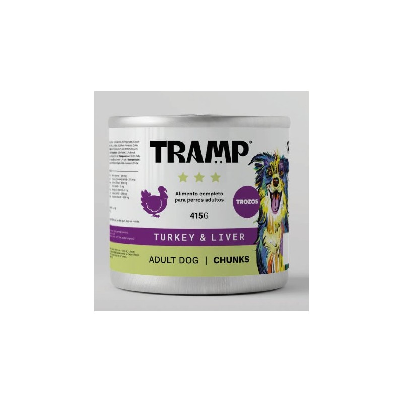 TRAMP 3* DOG CHUNKS WITH TURKEY ANDE LIVER ofrece una alimentación húmeda completa y sabrosa, elaborada con más del 68% de carne y subproductos animales y un 25% de caldo natural que potencia la jugosidad y mejora la palatabilidad. Su formato con trozos en salsa ("chunks") la convierte en una opción ideal para perros adultos de todas las razas, ya sea como alimento único o complemento al pienso seco.