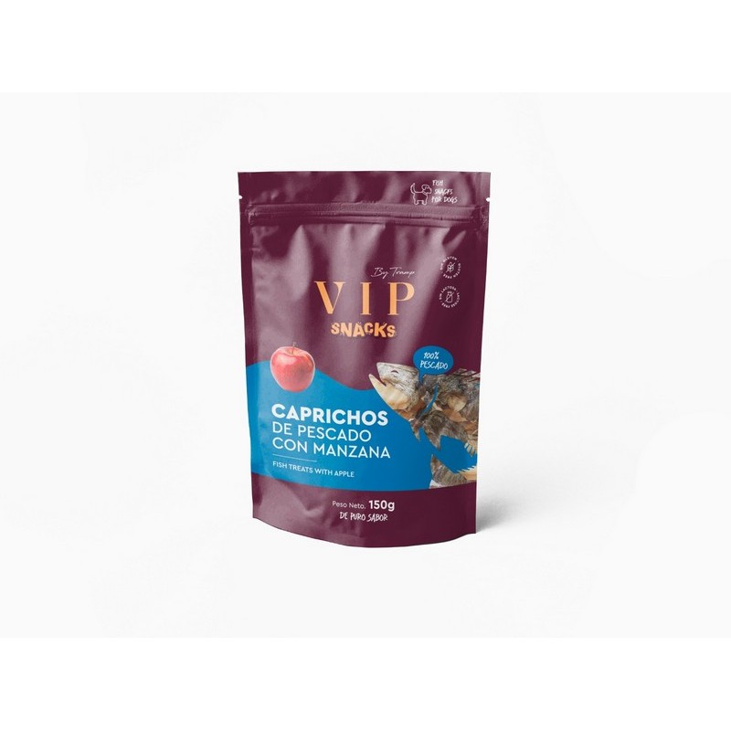 VIP Caprichos Pescado con Manzana, deliciosos snacks elaborados con pescado de alta calidad, fuente natural de proteínas y ácidos grasos Omega 3, que ayudan a mantener una piel sana, un pelaje brillante y unas articulaciones fuertes.